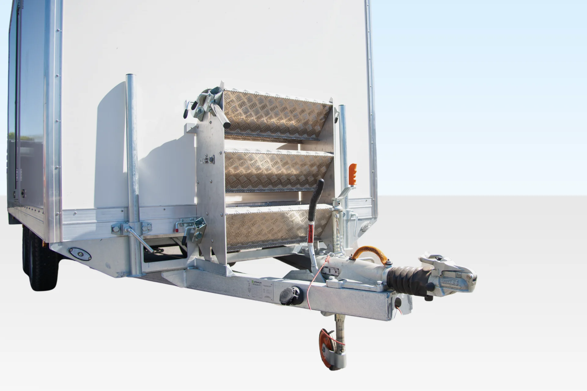 Access to the unit is via strong but lightweight aluminium steps (with stainless steel handrails), which connect neatly and easily to the A frame during transport.
