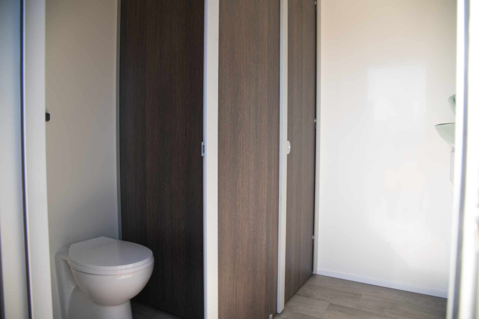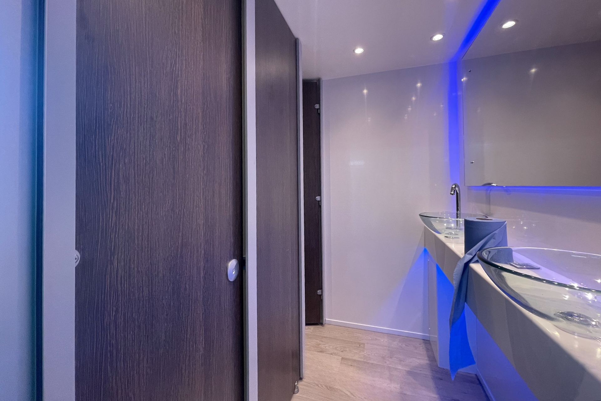 Cubicle panels in SGL 13mm wenge colour range seperate the handwashing area and toilets, the cubicle doors have locks with in-use indicators and external emergency releases. Toilets are ceramic back to wall with concealed flush tanks and soft close seats.